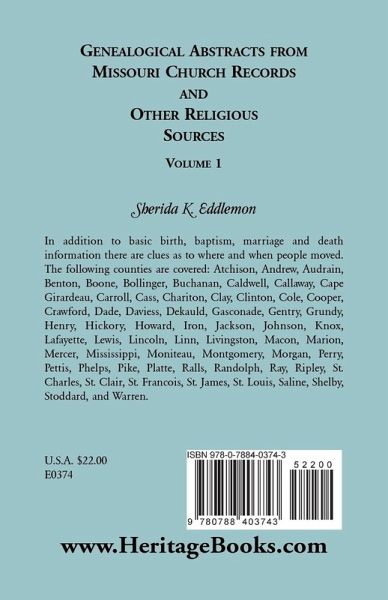 In addition to basic birth, baptism, marriage and death information there are clues as to where and when people moved. The following counties are covered: Atchison, Andrew, Audrain, Benton, Boone, Bollinger, Buchanan, Caldwell, Callaway, Cape Girardeau, Carroll, Cass, Chariton, Clay, Clinton, Cole, Cooper, Crawford, Dade, Daviess, Dekauld, Gasconade, Gentry, Grundy, Henry, Hickory, Howard, Iron, Jackson, Johnson, Knox, Lafayette, Lewis, Lincoln, Linn, Livingston, Macon, Marion, Mercer, Mississippi, Moniteau, Montgomery, Morgan, Perry, Pettis, Phelps, Pike, Platte, Ralls, Randolph, Ray, Ripley, St. Charles, St. Clair, St. Francois, St. James, St. Louis, Saline, Shelby, Stoddard, and Warren.
