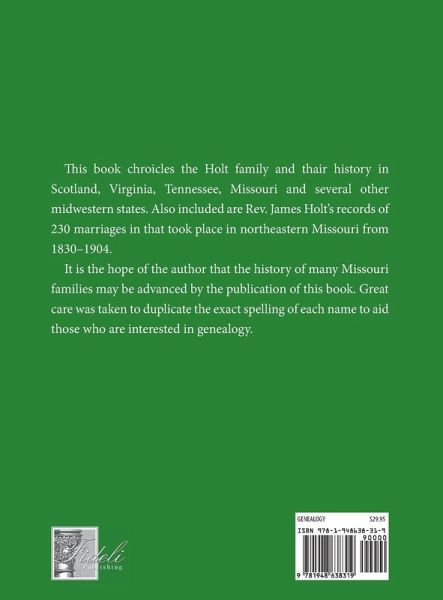 This book chroicles the Holt family and thair history in Scotland, Virginia, Tennessee, Missouri and several other midwestern states. Also included are Rev. James Holt's records of 230 marriages in that took place in northeastern Missouri from 1830-1904. It is the hope of the author that the history of many Missouri families may be advanced by the publication of this book. Great care was taken to duplicate the exact spelling of each name to aid those who are interested in genealogy.