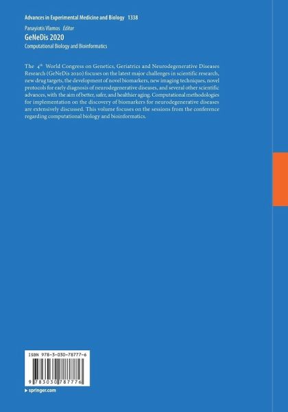 The 4th World Congress on Genetics, Geriatrics and Neurodegenerative Diseases Research (GeNeDis 2020) focuses on the latest major challenges in scientific research, new drug targets, the development of novel biomarkers, new imaging techniques, novel protocols for early diagnosis of neurodegenerative diseases, and several other scientific advances, with the aim of better, safer, and healthier aging. Computational methodologies for implementation on the discovery of biomarkers for neurodegenerative diseases are extensively discussed. This volume focuses on the sessions from the conference regarding computational biology and bioinformatics.