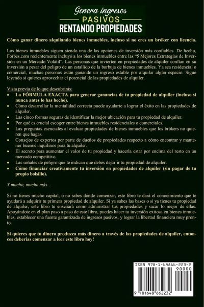 Cómo ganar dinero alquilando bienes inmuebles, incluso si no eres un bróker con licencia.Los bienes inmuebles siguen siendo una de las opciones de inversión más confiables. De hecho, Forbes.com recientemente incluyó a los bienes inmuebles entre las "5 Mejores Estrategias de Inversión en un Mercado Volátil". Las personas que invierten en propiedades de alquiler confían en su inversión a pesar del peligro de un estallido de la burbuja de bienes inmuebles. Ya sea residencial o comercial, muchas personas están ganando un ingreso estable por alquilar algún espacio. Sigue leyendo si quieres aprovechar el potencial de las propiedades de alquiler. Vista previa de lo que descubrirás:La FÓRMULA EXACTA para generar ganancias de tu propiedad de alquiler (incluso si nunca antes lo has hecho). Cómo desarrollar la mentalidad correcta puede ayudarte a lograr el éxito en las propiedades de alquiler. Las cinco formas seguras de identificar la mejor ubicación para tu propiedad de alquiler. Por qué es crucial escoger entre bienes inmuebles residenciales o comerciales. Las preguntas esenciales al evaluar propiedades de bienes inmuebles que los brókers no quieren que hagas. Consejos de expertos por parte de dueños de propiedades respecto a cómo encontrar y mantener buenos inquilinos para tu alquiler. El secreto para aumentar el valor de tu propiedad y hacerla estar por encima del resto en un mercado competitivo. Las señales de peligro que te indican que debes dejar ir tu propiedad de alquiler. Cómo financiar creativamente tu inversión en propiedades de alquiler (sin pagar de tu propio bolsillo). Y mucho, mucho más...Si no tienes mucho capital, o no sabes dónde comenzar, este libro te dará el conocimiento que te ayudará a adquirir tu primera propiedad de alquiler. Si ya sabes las bases o si ya tienes tu propiedad de alquiler, este libro te enseñará como administrar tus propiedades y sacar lo mejor de ellas.Apoyándote en el plan paso a paso de este libro, puedes hacer tu inversión exitosa en bienes inmuebles, establecer una fuente garantizada de ingresos pasivos, y lograr la libertad financiera muy pronto.Si quieres que tu dinero produzca más dinero a través de las propiedades de alquiler, entonces deberías comenzar a leer este libro hoy!