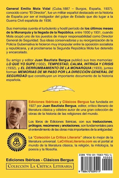 Memorias del turbulento período de los últimos meses de la Monarquía y la llegada de la República española. Prólogo, notas y un relato personal del célebre crítico literario Juan Bautista Bergua. General Emilio Mola Vidal (Cuba,1887 - Burgos, España, 1937), conocido como "El Director", fue un militar español destacado en la historia de España por ser el instigador del golpe de Estado que dio lugar a la Guerra Civil española de 1936. Sus memorias cuenta el turbulento y hostil período de los últimos meses de la Monarquía y la llegada de la República, entre 1930 y 1931, cuando Mola ocupó uno de los puestos de mayor responsabilidad como Director General de Seguridad. Sus ideas conservadoras y su reorganización de la Policía Gubernativa le hicieron muy impopular entre la oposición socialista y republicana, y al proclamarse la Segunda República Mola fue detenido y encarcelado. Su amigo y editor Juan Bautista Bergua publicó sus tres memorias: LO QUE YO SUPE (1932), TEMPESTAD, CALMA, INTRIGA Y CRISIS (1932), y EL DERRUMBAMIENTO DE LA MONARQUIA (1933), juntas forman MEMORIAS DE MI PASO POR LA DIRECCIÓN GENERAL DE SEGURIDAD que constituyen un importante documento de la historia española.