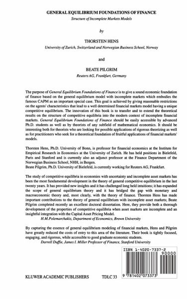 The purpose of this book is to give a sound economic foundation of finance. Finance is a coherent branch of applied economics that is designed to understand financial markets in order to give advice for practical financial decisions. This book argues that for a sound economic foundation of finance the famous general equilibrium model which in its modern form emphasizes the incompleteness of financial markets is well suited. The aim of the book is to demonstrate that financial markets can be meaningfully embedded into a more general system of markets including, for example, commodity markets. The interaction of these markets can be described via the well known notion of a competitive equilibrium. We argue that for a sound foundation this competitive equilibrium should be unique. In a first step we demonstrate that this essential goal cannot of be achieved based only on the rationality principle, i. e. on the assumption utility maximization of some utility function subject to the budget constraint. In particular we show that this important lack of structure is disturbing as well for the case of mean-variance utility functions which are the basis of the Capital Asset Pricing Model, one of the cornerstones of finance. The final goal of our book is to give reasonable restrictions on the agents' utility functions which lead to a well determined financial markets model.