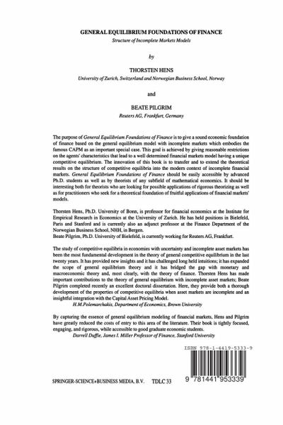 The purpose of this book is to give a sound economic foundation of finance. Finance is a coherent branch of applied economics that is designed to understand financial markets in order to give advice for practical financial decisions. This book argues that for a sound economic foundation of finance the famous general equilibrium model which in its modern form emphasizes the incompleteness of financial markets is well suited. The aim of the book is to demonstrate that financial markets can be meaningfully embedded into a more general system of markets including, for example, commodity markets. The interaction of these markets can be described via the well known notion of a competitive equilibrium. We argue that for a sound foundation this competitive equilibrium should be unique. In a first step we demonstrate that this essential goal cannot of be achieved based only on the rationality principle, i. e. on the assumption utility maximization of some utility function subject to the budget constraint. In particular we show that this important lack of structure is disturbing as well for the case of mean-variance utility functions which are the basis of the Capital Asset Pricing Model, one of the cornerstones of finance. The final goal of our book is to give reasonable restrictions on the agents' utility functions which lead to a well determined financial markets model.