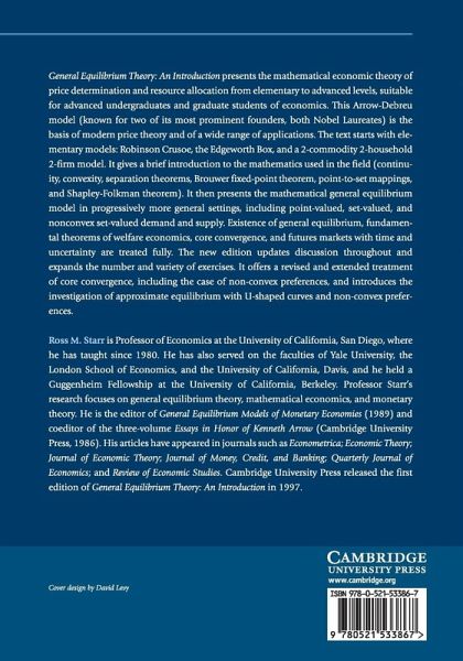 Ross M. Starr is Professor of Economics at the University of California, San Diego, where he has taught since 1980. He has also served on the faculties of Yale University, Connecticut, the London School of Economics and Political Science and the University of California, Davis, and he held a Guggenheim Fellowship at the University of California, Berkeley. Professor Starr's research focuses on general equilibrium theory, mathematical economics and monetary theory. He is the editor of General Equilibrium Models of Monetary Economies (1989) and coeditor of the three-volume Essays in Honor of Kenneth Arrow (Cambridge, 1986). His articles have appeared in journals such as Econometrica, Economic Theory, the Journal of Economic Theory, the Journal of Money, Credit, and Banking, the Quarterly Journal of Economics and the Review of Economic Studies. Cambridge University Press released the first edition of General Equilibrium Theory: An Introduction in 1997.