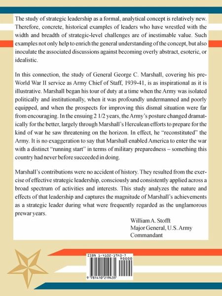 The study of strategic leadership as a formal, analytical concept is relatively new. Therefore, concrete, historical examples of leaders who have wrestled with the width and breadth of strategic-level challenges are of inestimable value. Such examples not only help to enrich the general understanding of the concept, but also inoculate the associated discussions against becoming overly abstract, esoteric, or idealistic. In this connection, the study of General George C. Marshall, covering his pre-World War II service as Army Chief of Staff, 1939-41, is as inspirational as it is illustrative. Marshall began his tour of duty at a time when the Army was isolated politically and institutionally, when it was profoundly undermanned and poorly equipped, and when the prospects for improving this dismal situation were far from encouraging. In the ensuing 2 1/2 years, the Army's posture changed dramatically for the better, largely through Marshall's Herculean efforts to prepare for the kind of war he saw threatening on the horizon. In effect, he "reconstituted" the Army. It is no exaggeration to say that Marshall enabled America to enter the war with a distinct "running start" in terms of military preparedness - something this country had never before succeeded in doing. Marshall's contributions were no accident of history. They resulted from the exercise of effective strategic leadership, consciously and consistently applied across a broad spectrum of activities and interests. This study analyzes the nature and effects of that leadership and captures the magnitude of Marshall's achievements as a strategic leader during what were frequently regarded as the unglamorous prewar years. William A. Stofft Major General, U.S. Army Commandant