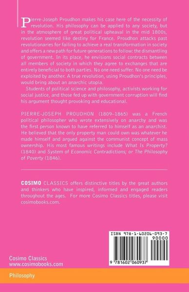 Pierre-Joseph Proudhon makes his case here of the necessity of revolution. His philosophy can be applied to any society, but in the atmosphere of great political upheaval in the mid 1800s, revolution seemed like destiny for France. Proudhon attacks past revolutionaries for failing to achieve a real transformation in society and offers a new path for future generations to follow: the dismantling of government. In its place, he envisions social contracts between all members of society in which they agree to exchanges that are entirely beneficial to both parties. No one need suffer. No one need be exploited by another. A true revolution, using Proudhon's principles, would bring about an anarchic utopia. Students of political science and philosophy, activists working for social justice, and those fed up with government corruption will find his argument thought provoking and educational. PIERRE-JOSEPH PROUDHON (1809-1865) was a French political philosopher who wrote extensively on anarchy and was the first person known to have referred to himself as an anarchist. He believed that the only property man could own was whatever he made himself and argued against the communist concept of mass ownership. His most famous writings include What Is Property? (1840) and System of Economic Contradictions; or The Philosophy of Poverty (1846).