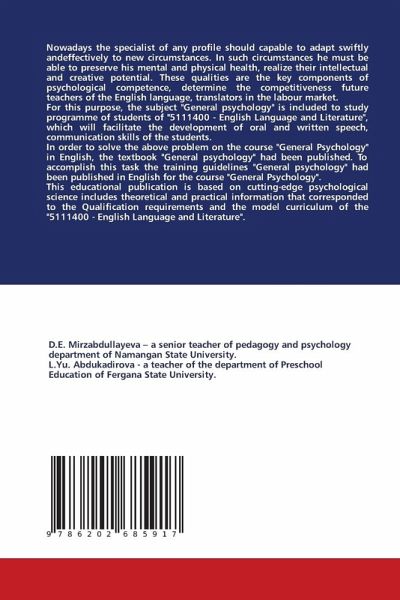 Nowadays the specialist of any profile should capable to adapt swiftly andeffectively to new circumstances. In such circumstances he must be able to preserve his mental and physical health, realize their intellectual and creative potential. These qualities are the key components of psychological competence, determine the competitiveness future teachers of the English language, translators in the labour market. For this purpose, the subject "General psychology" is included to study programme of students of "5111400 - English Language and Literature", which will facilitate the development of oral and written speech, communication skills of the students. In order to solve the above problem on the course "General Psychology" in English, the textbook "General psychology" had been published. To accomplish this task the training guidelines "General psychology" had been published in English for the course "General Psychology". This educational publication is based on cutting-edge psychological science includes theoretical and practical information that corresponded to the Qualification requirements and the model curriculum of the "5111400 - English Language and Literature".