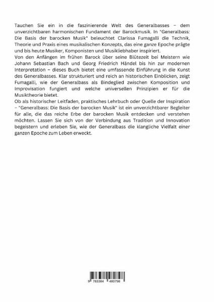 Tauchen Sie ein in die faszinierende Welt des Generalbasses - dem unverzichtbaren harmonischen Fundament der Barockmusik. In "Generalbass: Die Basis der barocken Musik" beleuchtet Clarissa Fumagalli die Technik, Theorie und Praxis eines musikalischen Konzepts, das eine ganze Epoche prägte und bis heute Musiker, Komponisten und Musikliebhaber inspiriert.Von den Anfängen im frühen Barock über seine Blütezeit bei Meistern wie Johann Sebastian Bach und Georg Friedrich Händel bis hin zur modernen Interpretation - dieses Buch bietet eine umfassende Einführung in die Kunst des Generalbasses. Klar strukturiert und reich an historischen Einblicken, zeigt Fumagalli, wie der Generalbass als Bindeglied zwischen Komposition und Improvisation fungiert und welche universellen Prinzipien er für die Musiktheorie bietet.Ob als historischer Leitfaden, praktisches Lehrbuch oder Quelle der Inspiration - "Generalbass: Die Basis der barocken Musik" ist ein unverzichtbarer Begleiter für alle, die das reiche Erbe der barocken Musik entdecken und verstehen möchten. Lassen Sie sich von der Verbindung aus Tradition und Innovation begeistern und erleben Sie, wie der Generalbass die klangliche Vielfalt einer ganzen Epoche zum Leben erweckt.