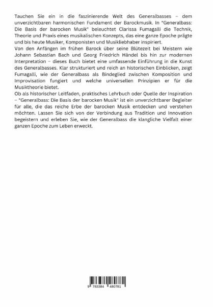 Tauchen Sie ein in die faszinierende Welt des Generalbasses - dem unverzichtbaren harmonischen Fundament der Barockmusik. In "Generalbass: Die Basis der barocken Musik" beleuchtet Clarissa Fumagalli die Technik, Theorie und Praxis eines musikalischen Konzepts, das eine ganze Epoche prägte und bis heute Musiker, Komponisten und Musikliebhaber inspiriert.Von den Anfängen im frühen Barock über seine Blütezeit bei Meistern wie Johann Sebastian Bach und Georg Friedrich Händel bis hin zur modernen Interpretation - dieses Buch bietet eine umfassende Einführung in die Kunst des Generalbasses. Klar strukturiert und reich an historischen Einblicken, zeigt Fumagalli, wie der Generalbass als Bindeglied zwischen Komposition und Improvisation fungiert und welche universellen Prinzipien er für die Musiktheorie bietet.Ob als historischer Leitfaden, praktisches Lehrbuch oder Quelle der Inspiration - "Generalbass: Die Basis der barocken Musik" ist ein unverzichtbarer Begleiter für alle, die das reiche Erbe der barocken Musik entdecken und verstehen möchten. Lassen Sie sich von der Verbindung aus Tradition und Innovation begeistern und erleben Sie, wie der Generalbass die klangliche Vielfalt einer ganzen Epoche zum Leben erweckt.