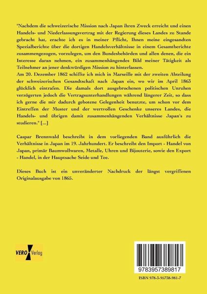 Caspar Brennwald beschreibt in dem vorliegenden Band ausführlich die Verhältnisse in Japan im 19. Jahrhundert. Er beschreibt den Import - Handel von Japan, primär Baumwollwaren, Metalle, Uhren und Bijouterie, sowie den Export - Handel, in der Hauptsache Seide und Tee.