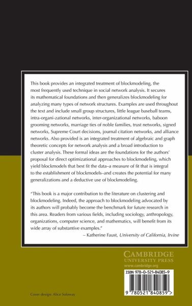 After establishing its mathematical foundations, this integrated study of blockmodeling, the most frequently used technique in social network analysis, generalizes blockmodeling for the examination of many network structures. It also includes a broad introduction to cluster analysis. The authors propose direct optimizational approaches to blockmodeling which yield blockmodels that best fit the data, and create the potential for many generalizations and a deductive use of blockmodeling.