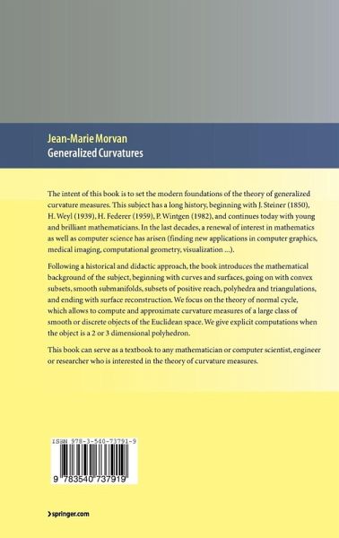 The intent of this book is to set the modern foundations of the theory of generalized curvature measures. This subject has a long history, beginning with J. Steiner (1850), H. Weyl (1939), H. Federer (1959), P. Wintgen (1982), and continues today with young and brilliant mathematicians. In the last decades, a renewal of interest in mathematics as well as computer science has arisen (finding new applications in computer graphics, medical imaging, computational geometry, visualization ...).