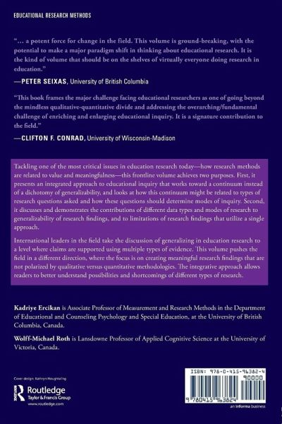 "This book frames the major challenge facing educational researchers as one of going beyond the mindless qualitative-quantitative divide and addressing the overarching/fundamental challenge of enriching and enlarging educational inquiry. It is a signature contribution to the field." - Clifton F. Conrad, University of Wisconsin-Madison, USA Tackling one of the most critical issues in education research today - how research methods are related to value and meaningfulness - this frontline volume achieves two purposes. First, it presents an integrated approach to educational inquiry that works toward a continuum instead of a dichotomy of generalizability, and looks at how this continuum might be related to types of research questions asked and how these questions should determine modes of inquiry. Second, it discusses and demonstrates the contributions of different data types and modes of research to generalizability of research findings, and to limitations of research findings that utilize a single approach. International leaders in the field take the discussion of generalizing in education research to a level where claims are supported using multiple types of evidence. The volume pushes the field in a different direction, where the focus is on creating meaningful research findings that are not polarized by qualitative versus quantitative methodologies. The integrative approach allows readers to better understand possibilities and shortcomings of different types of research.