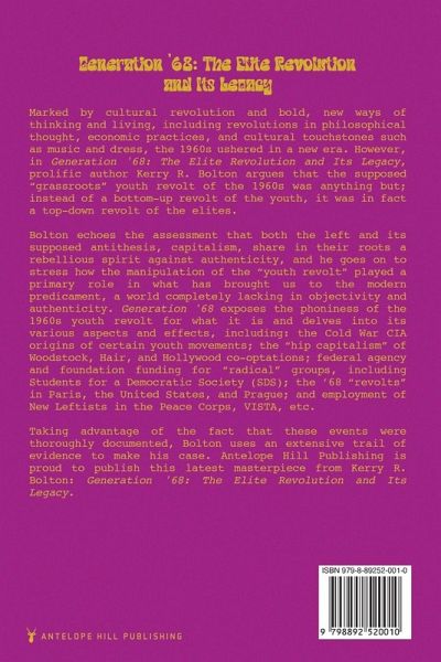Marked by cultural revolution and bold, new ways of thinking and living, including revolutions in philosophical thought, economic practices, and cultural touchstones such as music and dress, the 1960s ushered in a new era. However, in Generation '68: The Elite Revolution and Its Legacy, prolific author Kerry R. Bolton argues that the supposed "grassroots" youth revolt of the 1960s was anything but; instead of a bottom-up revolt of the youth, it was in fact a top-down revolt of the elites. Bolton echoes the assessment that both the left and its supposed antithesis, capitalism, share in their roots a rebellious spirit against authenticity, and he goes on to stress how the manipulation of the "youth revolt" played a primary role in what has brought us to the modern predicament, a world completely lacking in objectivity and authenticity. Generation '68 exposes the phoniness of the 1960s youth revolt for what it is and delves into its various aspects and effects, including: the Cold War CIA origins of certain youth movements; the "hip capitalism" of Woodstock, Hair, and Hollywood co-optations; federal agency and foundation funding for "radical" groups, including Students for a Democratic Society (SDS); the '68 "revolts" in Paris, the United States, and Prague; and employment of New Leftists in the Peace Corps, VISTA, etc. Taking advantage of the fact that these events were thoroughly documented, Bolton uses an extensive trail of evidence to make his case. Antelope Hill Publishing is proud to publish this latest masterpiece from Kerry R. Bolton: Generation '68: The Elite Revolution and Its Legacy.