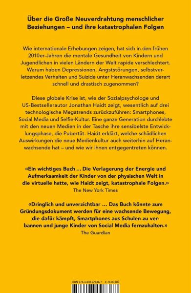 Die Folgen dieses Experiments waren, wie Jonathan Haidt auf Grundlage umfangreichen Datenmaterials zeigt, katastrophal - und sie betreffen auch die heute Heranwachsenden. Die schnellste und allumfassendste Neuverdrahtung menschlicher Beziehungen führte dazu, dass sich die mentale Gesundheit der Kinder und Jugendlichen rapide und dauerhaft verschlechtert hat. Dieser Entwicklung müssen wir jetzt entgegentreten: Haidt erklärt, was Regierungen, Schulen und Eltern tun können, um Kindern ein gesundes Aufwachsen zu ermöglichen.