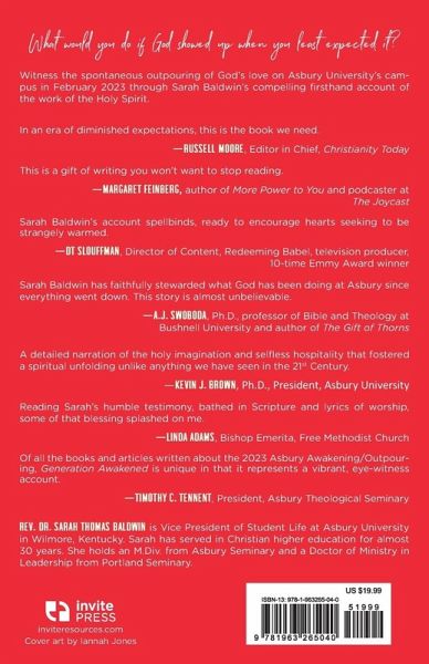 Everybody wants an encounter with the divine. But it can be tempting to try to manufacture religious experiences, make God into what we want God to be, or manipulate the movement of God in our lives. So, what happens when God shows up organically and unexpectedly, on an average day on a college campus...and changes everything? On February 8, 2023, a Gen Z-led chapel at Asbury University sparked an unplanned, unproduced outpouring of God's love that would ultimately draw thousands of people from around the world to the tiny town of Wilmore, Kentucky, all in search of something - to satisfy their curiosity, to find hope, to meet God. Meanwhile, those who watched from a distance wondered: "What's happening here?" and, "Is this real?" In Generation Awakened, Sarah Baldwin, Vice President of Student Life at Asbury, gives a firsthand, day-by-day account of the Asbury revival: the tangible presence of God's love; the intersection of the human and the divine; the complex decisions that stewarded the movement; and the stories of freedom, healing, and reconciliation that poured out of Hughes Auditorium during those two remarkable weeks in February. As you read, you will be transported into the room with Sarah, giving you a chance to witness what happened for yourself and decide what you think it means. This book isn't an explanation; it's an invitation - to go on the journey as it unfolded and to, perhaps, have your own encounter with the divine in its pages. For anyone who wants something to believe in, who is longing for something bigger, who desperately hopes that God is not only real but is loving and good...prepare to be surprised, amazed, and have your faith restored by the authentic presence of God.