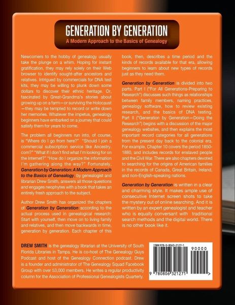 This genealogy guidebook discusses relationships between family members, naming practices, genealogy software, how to review existing research, the basics of DNA testing, the major genealogy websites, and older record categories.