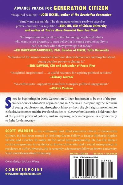 "Enter Generation Citizen, an organization dedicated to empowering youth through revitalizing civics education across America. Since its beginnings in 2009 during CEO and co-founder Scott Warren's senior year at Brown, Generation Citizen has grown to become one of the most pre-eminent civics education organizations in the country. Generation Citizen: The Power of Youth in Our Politics details Warren's international upbringing and political awakening alongside stories of how young people have always been the vanguard of political change. Generation Citizen is also a practical guide, providing concrete steps to jumpstart an engagement with politics. Through interviews with students and historical portraits of young people who have enacted great political change--from the Civil Rights movement to the election of Ronald Reagan to #BlackLivesMatter and the Parkland students standing up to gun violence--Generation Citizen shows that time and again, it is the young people who lead the way to change"--