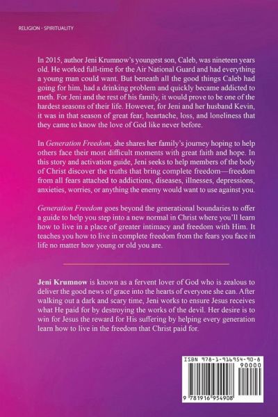 Fears, addiction, diseases, illnesses, anxieties, worries... These obstacles hinder us from achieving happiness in our lives. Confused and dazed, we wander, looking for the light, finding purpose and meaning. Many believers and Christians long to live the life Jesus speaks of in the New Testament. However, they find themselves falling short. They don't know how to avail themselves of the promises available to them. Christ does not discriminate against his people by their generation, be they baby boomers, millennials, Gen X, Y, or Z. Author Jenifer Krumnow is on a mission to inaugurate a new era called "Gen Frees." This generation will include every individual, from the newborn to the person breathing their last breaths on earth. This generation will learn to embrace complete freedom from the shackles of the enemy and claim victory in life. They will be equipped to take on the enemy, the evil one who traps us and manifests obstacles in our lives. With her Generation Freedom Activation Guide, Jeni Krumnow presents a guide on how to live life in keeping with God's teachings, learning to live without fear. Generation Freedom Activation Guide is a 12-week workbook asking you to write and/or say what you're thankful for through confessions, decrees, and a memory verse. Moreover, this book is designed to keep you tethered to the promises of God as you walk through faith in your transformational season. The author helps you realize that you are considered a king and a priest, so you'll issue decrees that will cause the spiritual forces of the demonic realm to bend a knee, allowing you a breakthrough that you have been patiently waiting for. The book encapsulates the beauty of Christian freedom, spiritual healing, Biblical promises, Christian self-help, Christian living, Spiritual Growth, and Personal Transformation in seeking healing and recovery from life's traumas.
