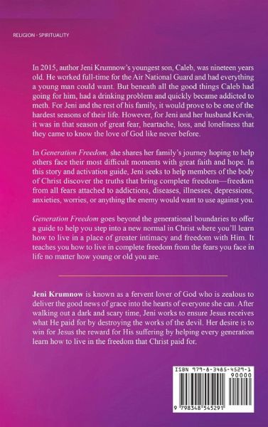 Fears, addiction, diseases, illnesses, anxieties, worries... These obstacles hinder us from achieving happiness in our lives. Confused and dazed, we wander, looking for the light, finding purpose and meaning. Many believers and Christians long to live the life Jesus speaks of in the New Testament. However, they find themselves falling short. They don't know how to avail themselves of the promises available to them. Christ does not discriminate against his people by their generation, be they baby boomers, millennials, Gen X, Y, or Z. Author Jenifer Krumnow is on a mission to inaugurate a new era called "Gen Frees." This generation will include every individual, from the newborn to the person breathing their last breaths on earth. This generation will learn to embrace complete freedom from the shackles of the enemy and claim victory in life. They will be equipped to take on the enemy, the evil one who traps us and manifests obstacles in our lives. With her Generation Freedom Activation Guide, Jeni Krumnow presents a guide on how to live life in keeping with God's teachings, learning to live without fear. Generation Freedom Activation Guide is a 12-week workbook asking you to write and/or say what you're thankful for through confessions, decrees, and a memory verse. Moreover, this book is designed to keep you tethered to the promises of God as you walk through faith in your transformational season. The author helps you realize that you are considered a king and a priest, so you'll issue decrees that will cause the spiritual forces of the demonic realm to bend a knee, allowing you a breakthrough that you have been patiently waiting for. The book encapsulates the beauty of Christian freedom, spiritual healing, Biblical promises, Christian self-help, Christian living, Spiritual Growth, and Personal Transformation in seeking healing and recovery from life's traumas.