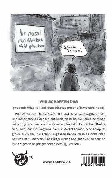 Wer im besten Deutschland lebt, das er je kennengelernt hat, und Informationen danach auswählt, dass sie die Laune nicht vermiesen, gehört zur starken Gemeinschaft der Generation GroKo.Aber nicht nur die Jüngeren, die nur Merkel kennen, sind komplett groko, auch alle, die schon vergessen haben, dass es nicht alternativlos ist zu merkeln. Egal, denn eine Gewissheit besteht: Wir schaffen das (was mit Wischen auf dem Display geschafft werden kann). Die Bürger wollen halt gar nicht so sehr an ihren eigenen Angelegenheiten beteiligt werden. Ruhestörer Bernd Zeller darf man deshalb getrost böse sein. Denn er hält der Generation GroKo schonungslos den Spiegel vor - in Text und Bild.