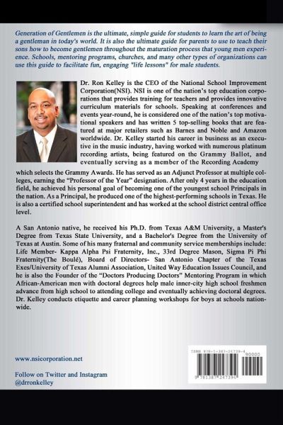 "Generation of Gentlemen" is the ultimate guide for young men to learn all about the art of being a gentleman. This unique, easy-to-read book teaches etiquette, dress, leadership skills, writing skills, and many other important "life lessons" for young men of all ages. This dynamic guide can be used as a valuable teaching tool by parents, educators, and mentors. The author, Dr. Ron Kelley, is a corporate CEO and former school principal who coordinates several award-winning mentoring programs and conducts workshops nationwide on etiquette and business skills.