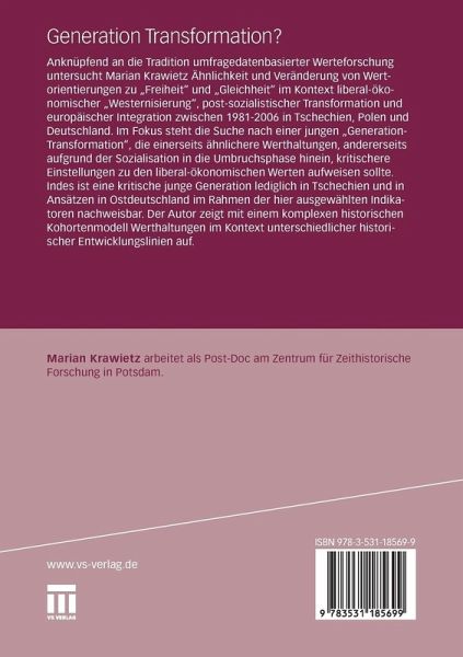 Anknüpfend an die Tradition umfragedatenbasierter Werteforschung untersucht Marian Krawietz Ähnlichkeit und Veränderung von Wertorientierungen zu "Freiheit" und "Gleichheit" im Kontext liberal-ökonomischer "Westernisierung", post-sozialistischer Transformation und europäischer Integration zwischen 1981-2006 in Tschechien, Polen und Deutschland. Im Fokus steht die Suche nach einer jungen "Generation-Transformation", die einerseits ähnlichere Werthaltungen, andererseits aufgrund der Sozialisation in die Umbruchsphase hinein, kritischere Einstellungen zu den liberal-ökonomischen Werten aufweisen sollte. Indes ist eine kritische junge Generation lediglich in Tschechien und in Ansätzen in Ostdeutschland im Rahmen der hier ausgewählten Indikatoren nachweisbar. Der Autor zeigt mit einem komplexen historischen Kohortenmodell Werthaltungen im Kontext unterschiedlicher historischer Entwicklungslinien auf.