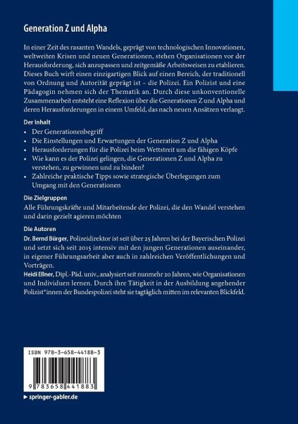 In einer Zeit des rasanten Wandels, geprägt von technologischen Innovationen, weltweiten Krisen und neuen Generationen, stehen Organisationen vor der Herausforderung, sich anzupassen und zeitgemäße Arbeitsweisen zu etablieren. Dieses Buch wirft einen einzigartigen Blick auf einen Bereich, der traditionell von Ordnung und Autorität geprägt ist - die Polizei. Ein Polizist und eine Pädagogin nehmen sich der Thematik an. Durch diese unkonventionelle Zusammenarbeit entsteht eine Reflexion über die Generationen Z und Alpha und deren Herausforderungen in einem Umfeld, das nach neuen Ansätzen verlangt.