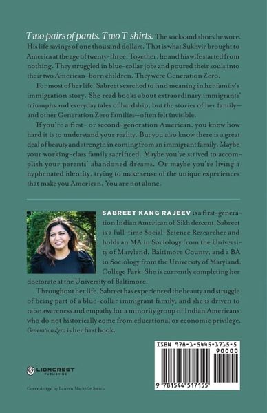 Two pants. Two T-shirts. The socks and shoes he wore. His life savings of one thousand dollars. That is what Sukhvir brought to America at the age of twenty-three. Together, he and his wife started from nothing. They struggled in blue-collar jobs and poured their souls into two American-born children. They were Generation Zero. For most of her life, Sabreet searched to find meaning in her family's immigration story. She read books about extraordinary immigrants' triumphs and everyday tales of hardship, but the stories of her family-and other Generation Zero families-often felt invisible. If you're a first- or second-generation American, you know how hard it is to understand your reality. But you also know there is a great deal of beauty and strength to come from an immigrant family. Maybe your working-class family sacrificed. Maybe you've strived to accomplish your parents' abandoned dreams. Or maybe you're living a hyphenated identity, trying to make sense of the unique experiences that make you American. You are not alone.