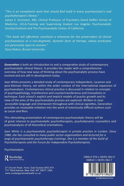 Generation is both an introduction to and a comparative study of contemporary psychoanalytic clinical theory. It provides the reader with a comprehensive overview of how new ways of thinking about the psychoanalytic process have evolved and are still in development today. Jean White presents a detailed study of contemporary Independent, Lacanian and post-Kleinian theory, set within the wider context of the international expansion of psychoanalysis. Contemporary clinical practice is discussed in relation to concepts of psychopathology, transference and countertransference and innovations in technique. Each school's explicit and implicit models of psychic growth and their view of the aims of the psychoanalytic process are explored. Written in clear, accessible language and interwoven throughout with clinical vignettes, Generation provides an invaluable initiation into the work of notoriously difficult authors such as Lacan and Bion. This stimulating presentation of contemporary psychoanalytic theory will be of great interest to psychoanalytic psychotherapists, psychodynamic counsellors and psychoanalysts of all theoretical orientations.