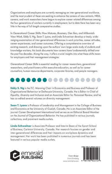 Eddy Ng is the F.C. Manning Chair in Economics and Business and Professor of Organizational Behaviour at Dalhousie University. His research focuses on managing diversity for organizational competitiveness, the changing nature of work and organizations, and managing an intergenerational workforce. His work has been funded by the Social Sciences and Humanities Research Council of Canada grants. He has published more than 80 peer-reviewed journal articles and book chapters. He co-edited the Research Handbook of International and Comparative Perspectives on Diversity Management (2016), International Handbook on Diversity Management at Work: Country Perspectives on Diversity and Equal Treatment (2014), and Managing the New Workforce: International Perspectives on the Millennial Generation (2012). He is Editor-in-Chief of Equality, Diversity and Inclusion and an Associate Editor for Personnel Review.Sean Lyons is Professor of Leadership and Management in the College of Business and Economics at the University of Guelph. His main area of research concerns inter-generational differences and their impacts on workplace dynamics and managing people. He is an Associate Editor of the journal Career Development International and serves as an editorial Board Member on the Journal of Organizational Behavior. His research on generational differences in work values and attitudes has been published in numerous journals, including journal of Organizational Behavior, Journal of Management and Psychology, International Journal of Human Resource Management, Journal of Business and Psychology, Sex Roles and Public Administration Review. It has also been featured in a number of media outlets, including Time Magazine, the Globe & Mail, the National Post, Macleans magazine, as well as on CBC's The National, CTV News Channel, the Business News Network and CBC Radio's The Current. Dr. Lyons works frequently with private and public sector organizations to identify and address inter-generational issues. Linda Schweitzer is Associate Professor and Interim Dean of the Sprott School of Business, Carleton University. She researches gender and inter-generational differences and their impacts on workplace dynamics and management. Her research has been published in numerous journals, including the Journal of Management and Psychology, Journal of Business and Psychology, Career Development International and Multivariate Behavioral Research. It has also been featured in a number of popular press including Sheryl Sandberg's Lean In, Time Magazine, Macleans magazine, and the Globe & Mail. Her work has been funded by the Social Sciences and Humanities Research Council of Canada grants.