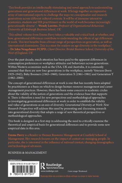 Over the past decade much attention has been paid to the apparent differences in consumption preferences or workplace attitudes and behaviours across generations. Within Western economies such as the USA, UK and Australia, it is commonly assumed that that there are now four generations in the workplace, namely Veterans (born 1925-1942), Baby Boomers (1943-1960), Generation X (1961-1981) and Generation Y (1982- 2000) The concept of generational differences at work is one that has recently been adopted by practitioners as a basis on which to design human resource management and career management practices. However, there has been some concern in academic circles about the validity of the notion of generations and the evidence base that supports it. There is therefore a need for new perspectives and methodological approaches to investigating generational differences at work in order to establish the validity and value of generations as an axis of diversity. Generational Diversity at Work: New Research Perspectives will address this need by presenting and discussing research into generational diversity that adopts a range of new theoretical perspectives or methodological approaches. This book is designed as a first step in addressing the need to critically examine the theoretical and empirical basis for generational differences and to provide some new empirical data in this area.