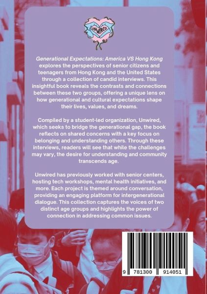 Generational Expectations: America VS Hong Kong explores the perspectives of senior citizens and teenagers from Hong Kong and the United States through a collection of candid interviews. This insightful book reveals the contrasts and connections between these two groups, offering a unique lens on how generational and cultural expectations shape their lives, values, and dreams. Compiled by a student-led organization, Unwired, which seeks to bridge the generational gap, the book reflects on shared concerns with a key focus on belonging and understanding others. Through these interviews, readers will see that while the challenges may vary, the desire for understanding and community transcends age. Unwired has previously worked with senior centers, hosting tech workshops, mental health initiatives, and more. Each project is themed around conversation, providing an engaging platform for intergenerational dialogue. This collection captures the voices of two distinct age groups and highlights the power of connection in addressing common issues.