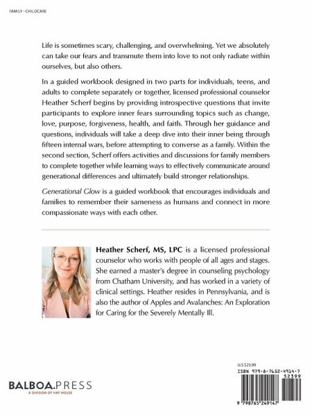 Generational Glow is designed for individuals, teens, and adults to do individually and/or together. It is a workbook designed to be done alone and/or with your family members. It is designed in two parts. The first fifteen small chapters are guided workbook questions to explore the inner fears you have as individuals surrounding topics such as change. love, purpose, health, and faith. Part two is designed for family members to then do together in effort to have some dialogue around our generational differences and help bridge the gap in communication with loved ones. The goal of the book is to remember our sameness, regardless of our story, and to connect in more compassionate ways with one another.