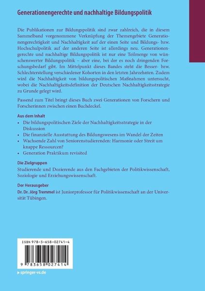 Die Publikationen zur Bildungspolitik sind zwar zahlreich, die in diesem Sammelband vorgenommene Verknüpfung der Themengebiete Generationengerechtigkeit und Nachhaltigkeit auf der einen Seite und Bildungs- bzw. Hochschulpolitik auf der anderen Seite ist allerdings neu. Generationengerechte und nachhaltige Bildungspolitik ist nur eine Teilmenge von wünschenswerter Bildungspolitik - aber eine, bei der es noch dringenden Forschungsbedarf gibt. Im Mittelpunkt dieses Bandes steht die Besser- bzw. Schlechterstellung verschiedener Kohorten in den letzten Jahrzehnten. Zudem wird die Nachhaltigkeit von bildungspolitischen Maßnahmen untersucht, wobei die Nachhaltigkeitsdefinition der Deutschen Nachhaltigkeitsstrategie zu Grunde gelegt wird.