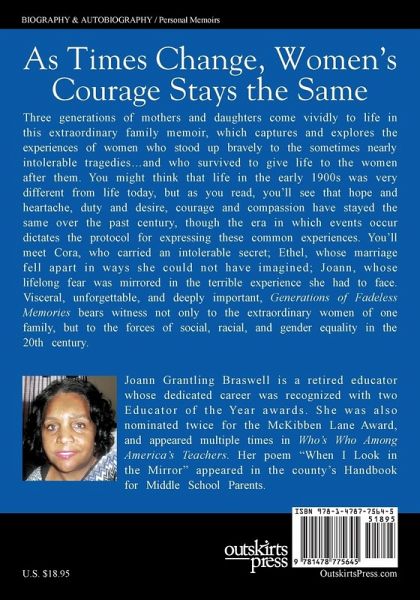 As Times Change, Women's Courage Stays the Same. . . Three generations of mothers and daughters come vividly to life in this extraordinary family memoir, which captures and explores the experiences of women who stood up bravely to the sometimes nearly intolerable tragedies...and who survived to give life to the women after them. You might think that life in the early 1900s was very different from life today, but as you read, you'll see that hope and heartache, duty and desire, courage and compassion have stayed the same over the past century, though the era in which events occur dictates the protocol for expressing these common experiences. You'll meet Cora, who carried an intolerable secret; Ethel, whose marriage fell apart in ways she could not have imagined; Joann, whose lifelong fear was mirrored in the terrible experience she had to face. Visceral, unforgettable, and deeply important, Generations of Fadeless Memories bears witness not only to the extraordinary women of one family, but to the forces of social, racial, and gender equality in the 20th century.