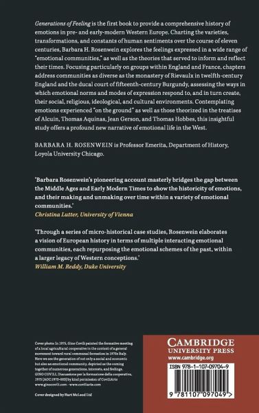 Generations of Feeling is the first book to provide a comprehensive history of emotions in pre- and early modern Western Europe. Charting the varieties, transformations and constants of human sentiments over the course of eleven centuries, Barbara H. Rosenwein explores the feelings expressed in a wide range of 'emotional communities' as well as the theories that served to inform and reflect their times. Focusing specifically on groups within England and France, chapters address communities as diverse as the monastery of Rievaulx in twelfth-century England and the ducal court of fifteenth-century Burgundy, assessing the ways in which emotional norms and modes of expression respond to, and in turn create, their social, religious, ideological, and cultural environments. Contemplating emotions experienced 'on the ground' as well as those theorized in the treatises of Alcuin, Thomas Aquinas, Jean Gerson and Thomas Hobbes, this insightful study offers a profound new narrative of emotional life in the West.