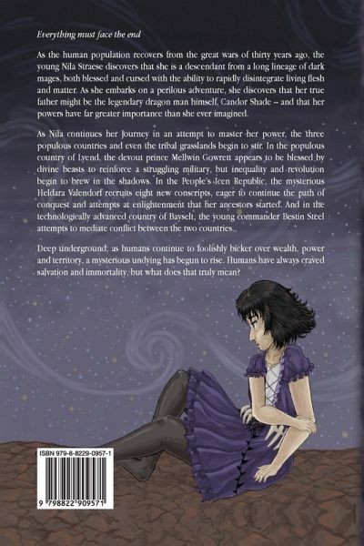 Everything must face the end. As the human population recovers from the great wars of thirty years ago, the young Nila Straese discovers that she is a descendant from a long lineage of dark mages, both blessed and cursed with the ability to rapidly disintegrate living flesh and matter. As she embarks on a perilous adventure, she discovers that her true father might be the legendary dragon man himself, Candor Shade -- and that her powers have far greater importance than she ever imagined. As Nila continues her journey in an attempt to master her power, the three populous countries and even the tribal grasslands begin to stir. In the populous country of Lyend, the devout prince Mellwin Gowrett appears to be blessed by divine beasts to reinforce a struggling military, but inequality and revolution begin to brew in the shadows. In the People's Icen Republic, the mysterious Heldara Valendorf recruits eight new conscripts, eager to continue the path of conquest and attempts at enlightenment that her ancestors started. And in the technologically advanced country of Bayselt, the young commander Bestin Steel attempts to mediate conflict between the two countries. Deep underground, as humans continue to foolishly bicker over wealth, power and territory, a mysterious undying has begun to rise. Humans have always craved salvation and immortality, but what does that truly mean?