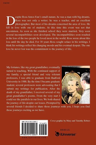 Despite Ross Amos Faw's small stature, he was a man with big dreams. Ross was not only a writer; he was a teacher, and an excellent photographer. But most of his dreams concerned the area of love. He fell in love with one of students. At this time this event was not that uncommon. As soon as she finished school they were married. Very soon several incompatibilities soon developed. The incompatibilities soon resulted in the loss of the two people he loved most in the world. Ross wrote about this loss until the day he died. For 30 years Ross sought solace in his writings. I think his writings reflect his changing moods and his eventual despair. The one love he never lost was the commitment to the journey of life.