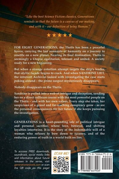 NOW: INCLUDING AN EXTRA BONUS NOVELETTE! "An epic science fiction noir!" - Publisher Weekly's BookLife ¿ "Extraordinary... dense and enthralling journey" - Kirkus Review ¿ "An amazing space story of mystery, adventure, and exploration. It's smart, funny, but above all, endearing" - Reader Views Are Humanity's leaders steering them into a trap? And can one woman stand up to power and uncover the biggest conspiracy in human history? The THETIS is humanity's last hope: a generation-ship carrying the last remnants of Earth to resettle on a new planet. But, under the facade of a tolerant and cooperative society, a vast conspiracy has been brewing - a deeply-buried secret that will determine the fate of humanity's new beginning. The key to uncovering that conspiracy lies in the hands of SANDRINE LIET, an Archivist introvert who has everything to lose by pitting herself against the most powerful people on the Thetis. The deeper she digs, the clearer it becomes that there is only one way to save both herself and the rest of her fellow Thetans - and it's the most horrible choice imaginable... GENERATIONS is a heart-pounding space mystery, an instant #1 Amazon Science Fiction New Release of 2024. * (a bonus novelette expanding on the Generations story is now available FOR FREE - find the access link at the end of the novel) What Readers Are Saying: ¿The book felt like watching a movie, and the action in the last 100 pages left me unable to put it down!¿ - Melany B., Amazon Reviewer "Brilliant book - stayed with me for days. A deep and fun read!" - Jenny B., Amazon Reviewer "Well written, interesting society, and a good plot. Definite page-turner" - Stuart C.,FB Science Fiction group moderator What The Media Is Saying: "A gripping and exciting story that was hard to put down. I loved it!" - Reader Views 5-Star Review "Generations delivers a profound exploration of human values, sacrifice, and the relentless pursuit of truth against all odds." - Reader's Favorite 5-Star Review "Generations proves as brisk and engaging as it is ambitious." - BookLife A+ review