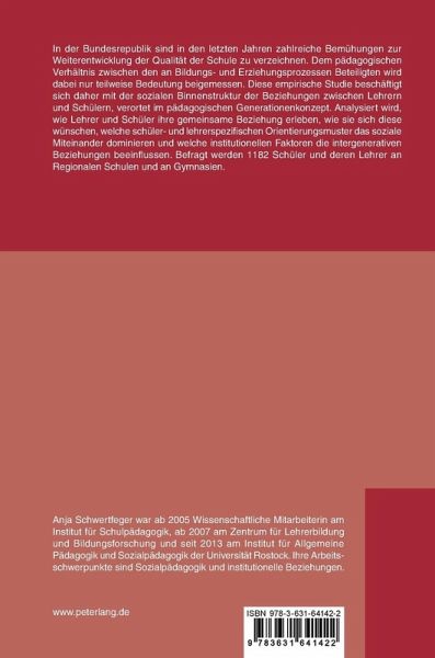 In der Bundesrepublik sind in den letzten Jahren zahlreiche Bemühungen zur Weiterentwicklung der Qualität der Schule zu verzeichnen. Dem pädagogischen Verhältnis zwischen den an Bildungs- und Erziehungsprozessen Beteiligten wird dabei nur teilweise Bedeutung beigemessen. Diese empirische Studie beschäftigt sich daher mit der sozialen Binnenstruktur der Beziehungen zwischen Lehrern und Schülern, verortet im pädagogischen Generationenkonzept. Analysiert wird, wie Lehrer und Schüler ihre gemeinsame Beziehung erleben, wie sie sich diese wünschen, welche schüler- und lehrerspezifischen Orientierungsmuster das soziale Miteinander dominieren und welche institutionellen Faktoren die intergenerativen Beziehungen beeinflussen. Befragt werden 1182 Schüler und deren Lehrer an Regionalen Schulen und an Gymnasien.