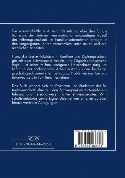 Die Autorin - Kauffrau und Diplompsychologin mit dem Schwerpunkt Arbeits- und Organisationspsychologie - liefert in dieser Arbeit erstmals einen psychologisch fundierten Beitrag zu Problemen des Generationswechsels in Familienunternehmen.