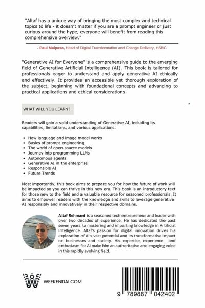 As we move forward into the 21st century, it's clear that artificial intelligence (AI) will play an increasingly important role in our lives. From self-driving cars to smart homes, AI is already transforming the way we live and work. But in order to fully realize the potential of AI, we need to understand how it works and how to apply it to real-world problems. This is where this book comes in. In this book, I will provide you with a comprehensive overview of Generative AI, including the underlying principles and the latest trends in the field. I will also show you how to apply generative AI to a variety of tasks and applications in your business as well as various other industries responsibly and safely. One of the key benefits of Generative AI is its ability to learn from massive realms of data and generate new, unseen data. This makes it a powerful tool for tasks such as text, code, image and video generation, where it can be used to create new realistic and detailed representations of the world. But perhaps the most important thing about Generative AI is its potential to solve some of the world's most pressing problems. From climate change to global poverty, Generative AI can help us to tackle these issues in ways that were previously impossible. So, if you want to prepare yourself for the future and stay ahead of the curve, it's time to start learning about Generative AI and this I believe is a great place to start or continue your journey.