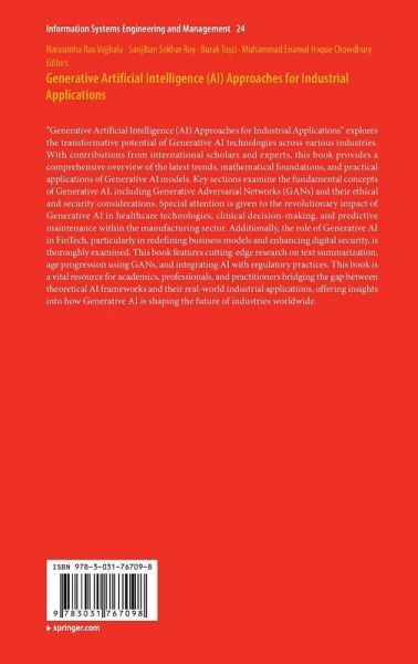 "Generative Artificial Intelligence (AI) Approaches for Industrial Applications" explores the transformative potential of Generative AI technologies across various industries. With contributions from international scholars and experts, this book provides a comprehensive overview of the latest trends, mathematical foundations, and practical applications of Generative AI models. Key sections examine the fundamental concepts of Generative AI, including Generative Adversarial Networks (GANs) and their ethical and security considerations. Special attention is given to the revolutionary impact of Generative AI in healthcare technologies, clinical decision-making, and predictive maintenance within the manufacturing sector. Additionally, the role of Generative AI in FinTech, particularly in redefining business models and enhancing digital security, is thoroughly examined. This book features cutting-edge research on text summarization, age progression using GANs, and integrating AI with regulatory practices. This book is a vital resource for academics, professionals, and practitioners bridging the gap between theoretical AI frameworks and their real-world industrial applications, offering insights into how Generative AI is shaping the future of industries worldwide.