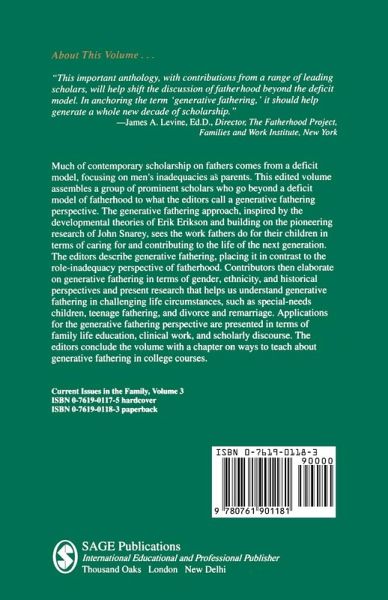 Much contemporary scholarship on fathers comes from a deficit model, focusing on men's inadequacies as parents. This volume goes beyond a deficit model of fatherhood to what the editors term a `generative fathering perspective'. This approach sees the work fathers do for their children in terms of caring for and contributing to the life of the next generation. Following a description of generative fathering, placing it in contrast to the role-inadequacy perspective of fatherhood, the contributors elaborate on generative fathering in terms of gender, ethnicity and historical perspectives. They present research that helps readers to understand generative fathering in challenging life circumstances, such as special-needs children, teenage fathering, divorce and remarriage. A chapter on ways to teach about generative fathering concludes the volume.