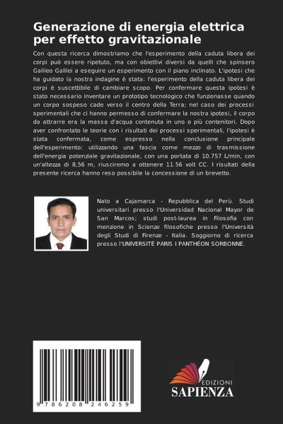 Con questa ricerca dimostriamo che l'esperimento della caduta libera dei corpi può essere ripetuto, ma con obiettivi diversi da quelli che spinsero Galileo Galilei a eseguire un esperimento con il piano inclinato. L'ipotesi che ha guidato la nostra indagine è stata: l'esperimento della caduta libera dei corpi è suscettibile di cambiare scopo. Per confermare questa ipotesi è stato necessario inventare un prototipo tecnologico che funzionasse quando un corpo sospeso cade verso il centro della Terra; nel caso dei processi sperimentali che ci hanno permesso di confermare la nostra ipotesi, il corpo da attrarre era la massa d'acqua contenuta in uno o più contenitori. Dopo aver confrontato le teorie con i risultati dei processi sperimentali, l'ipotesi è stata confermata, come espresso nella conclusione principale dell'esperimento: utilizzando una fascia come mezzo di trasmissione dell'energia potenziale gravitazionale, con una portata di 10.757 L/min, con un'altezza di 8,56 m, riusciremo a ottenere 11.56 volt CC. I risultati della presente ricerca hanno reso possibile la concessione di un brevetto.