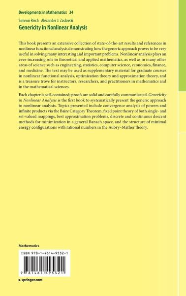 "The book ... contains a lot of interesting and deep generic existence results for some classes of problems in nonlinear analysis. By bringing together results spread through various journals, it will be of great help for researchers in fixed point theory, optimization, best approximation and dynamical systems. Being carefully written, with complete proofs and illuminating examples, it can serve also as an introductory book to this areas of current research." (S. Cobzas, Studia Universitatis Babes-Bolyai, Mathematica, Vol. 59 (1), 2014)