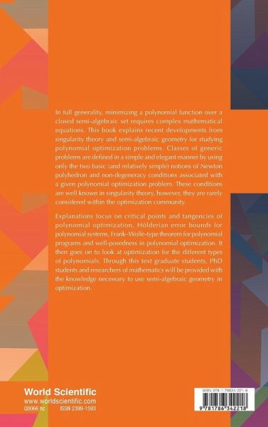 In full generality, minimizing a polynomial function over a closed semi-algebraic set requires complex mathematical equations. This book explains recent developments from singularity theory and semi-algebraic geometry for studying polynomial optimization problems. Classes of generic problems are defined in a simple and elegant manner by using only the two basic (and relatively simple) notions of Newton polyhedron and non-degeneracy conditions associated with a given polynomial optimization problem. These conditions are well known in singularity theory, however, they are rarely considered within the optimization community. Explanations focus on critical points and tangencies of polynomial optimization, Hölderian error bounds for polynomial systems, Frank–Wolfe-type theorem for polynomial programs and well-posedness in polynomial optimization. It then goes on to look at optimization for the different types of polynomials. Through this text graduate students, PhD students and researchers of mathematics will be provided with the knowledge necessary to use semi-algebraic geometry in optimization.