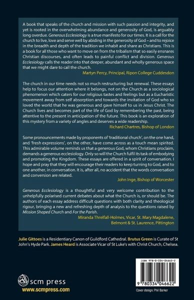 Generous Ecclesiology seeks to present a positive theological response to the issues raised by Mission-Shaped Church and For the Parish. The former reminds us that the church is to engage in creative and imaginative ways with our missionary calling. The latter affirms the place of inherited patterns and structures which cannot simply be discarded. Alert to the danger that discussion about tradition and innovation can become polarized; the editors recognize that living in relation to a generous God shapes our ecclesiology. This vocation is formed by a double constitution of worship and mission. This vocation is for the sake of the Kingdom of God. Generous Ecclesiology takes as its basis the uniqueness of the church's calling in God's world, a world embraced by the generosity of his love. This collection is a contribution to an ongoing conversation; to this end, it engages with a rich range of dialogue partners, historically, ecumenically and culturally as well as theologically. It seeks to offer a rigorous theological resource - inspiring us to drink deeply of the wells of our tradition and inherited patterns. Whether implicitly or explicitly, these essays reflect on or are shaped by the ordinary concerns, challenges and opportunities of ministry.