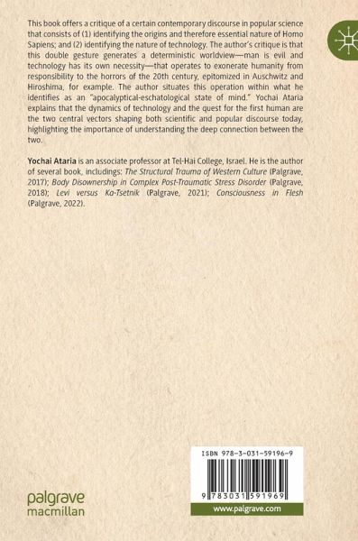 This book offers a critique of a certain contemporary discourse in popular science that consists of (1) identifying the origins and therefore essential nature of Homo Sapiens; and (2) identifying the nature of technology. The author's critique is that this double gesture generates a deterministic worldview - man is evil and technology has its own necessity - that operates to exonerate humanity from responsibility to the horrors of the 20th century, epitomized in Auschwitz and Hiroshima, for example. The author situates this operation within what he identifies as an "apocalyptical-eschatological state of mind". Yochai Ataria explains that the dynamics of technology and the quest for the first human are the two central vectors shaping both scientific and popular discourse today, highlighting the importance of understanding the deep connection between the two.